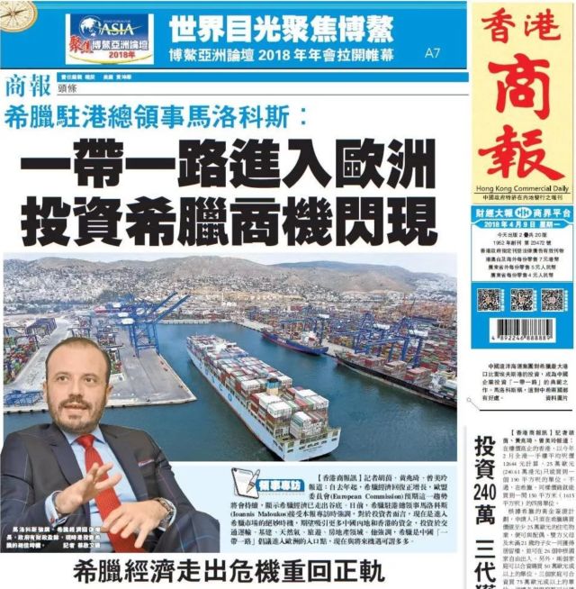 希腊驻港总领事马洛科斯(Ioannis Maloukos)接受香港商报专访时强调,对于投资者而言,现在是进入希腊市场的绝妙时机,期望吸引更多中国内地和香港的资金。他强调,希腊是中国「一带一路」倡议进入欧洲的入口点,现在与将来机遇可谓多多。